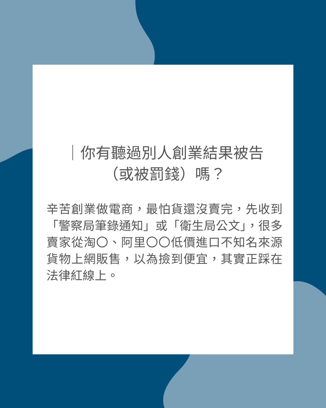 辛苦創業做電商,最怕貨還沒賣完,先收到「警察局筆錄通知」或「衛生局公文」,很多賣家從淘〇、阿里〇〇低價進口不知名來源貨物上網販售,以為撿到便宜,其實正踩在法律紅線上。