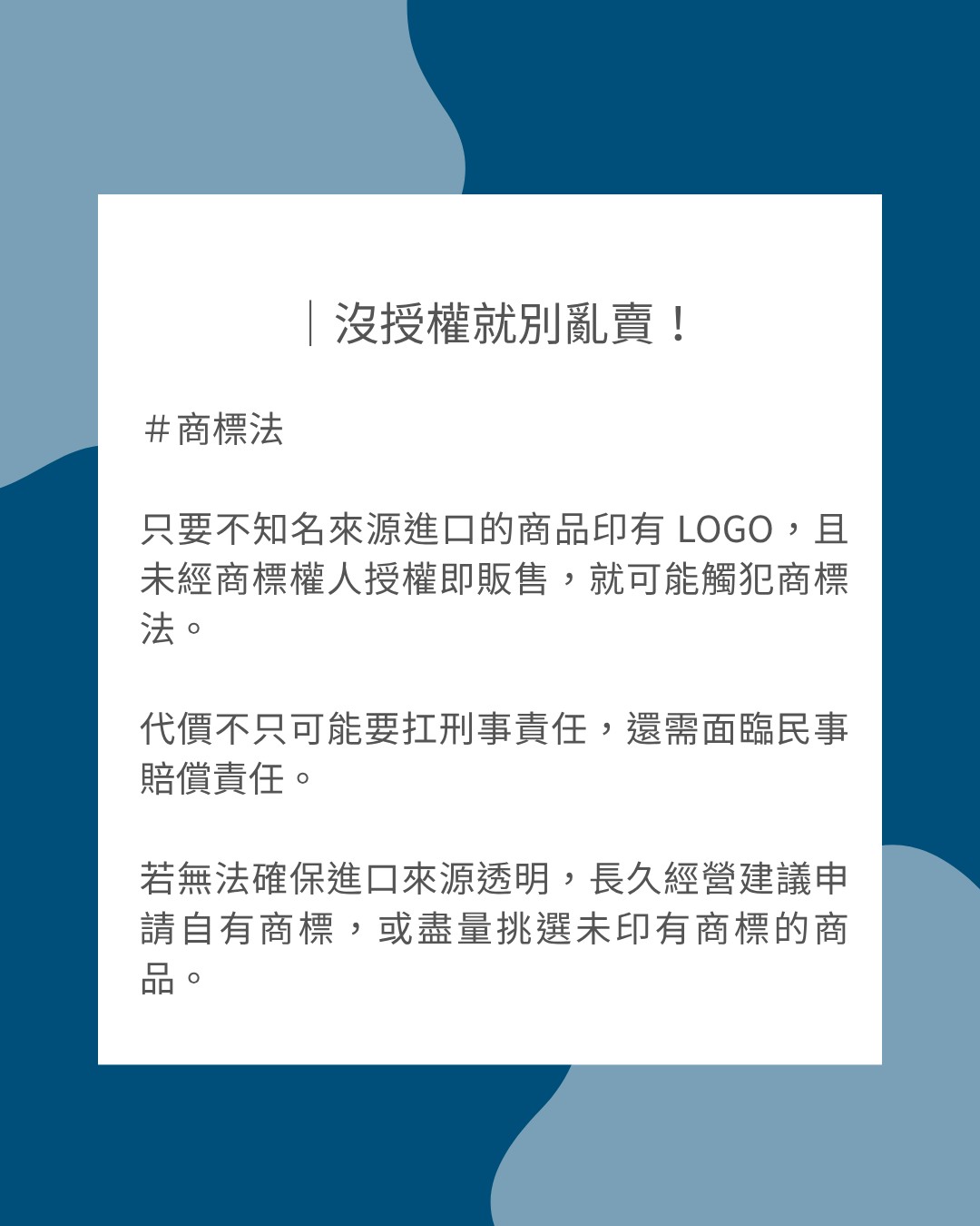 只要不知名來源進口的商品印有 LOGO,且未經商標權人授權即販售,就可能觸犯商標法。