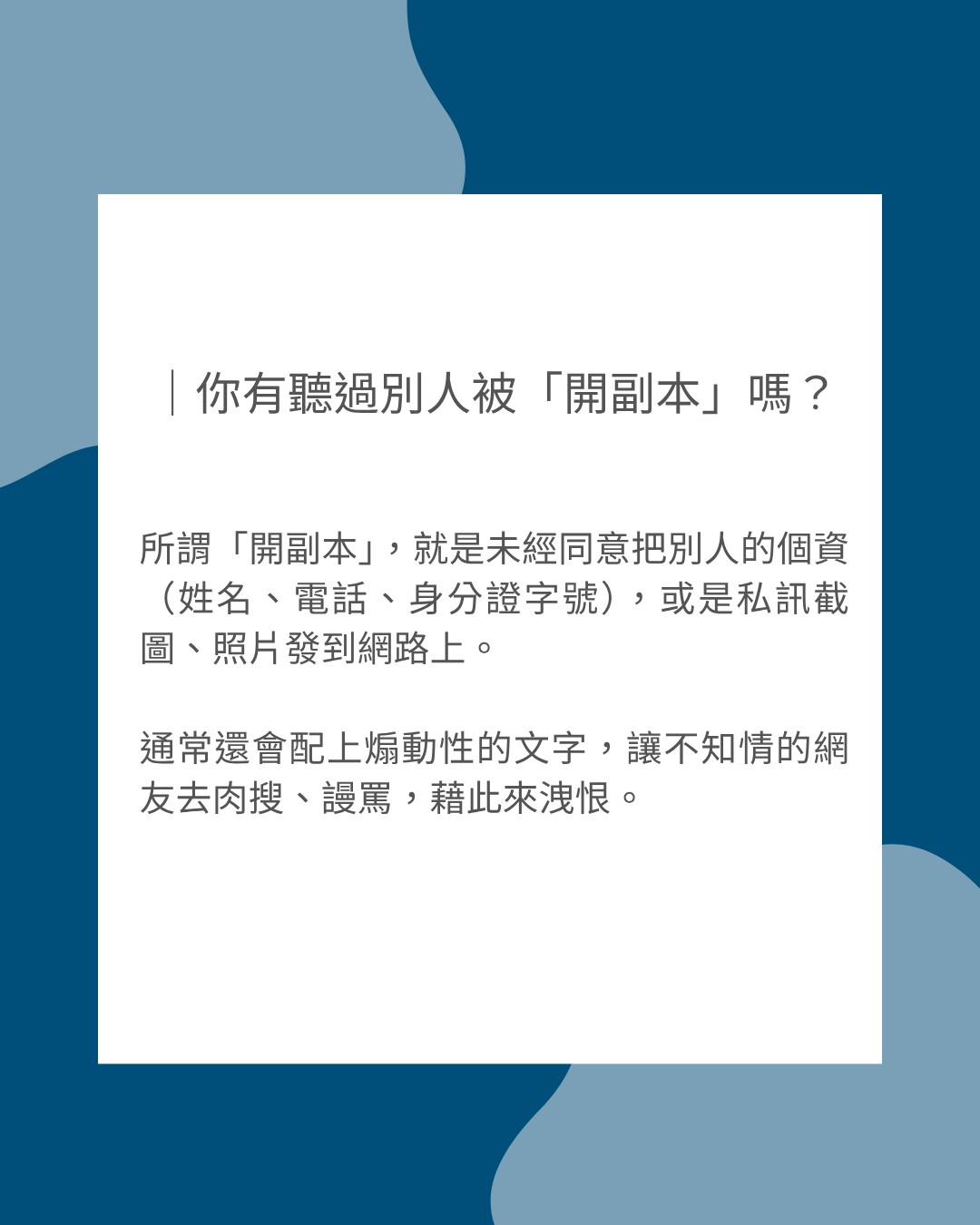 所謂「開副本」,就是未經同意把別人的個資(姓名、電話、身分證字號),或是私訊截圖、照片發到網路上,通常會配上煽動性的文字,讓不知情的網友去肉搜、謾罵,藉此來洩恨。
