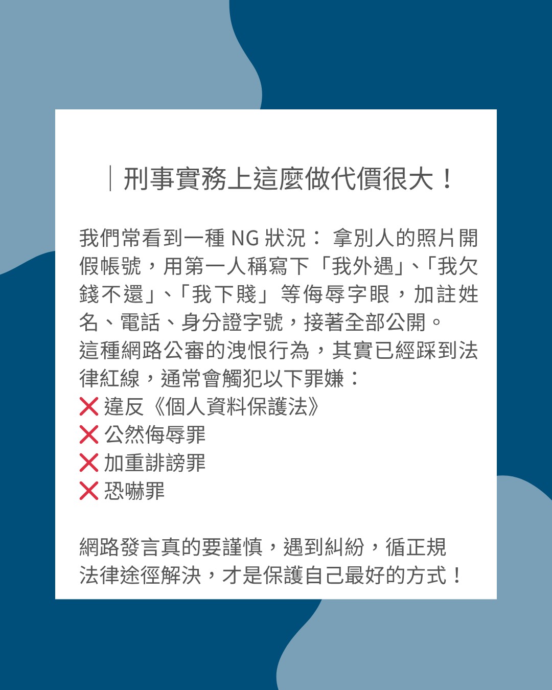 我們常看到一種 NG 狀況: 拿別人的照片開假帳號,用第一人稱寫下「我外遇」、「我欠錢不還」、「我下賤」等侮辱字眼,加註姓名、電話、身分證字號,接著全部公開。